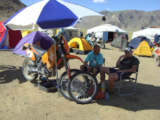Наш монгольский друг Радна в прошлом году насмотрелся на наши Ямахи и в этом году вытащил себе такую же, причем с баком от КТМа. На заднем плане — мой мотик и мой же дакарский ящик с запчастями.