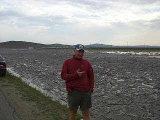 По дороге стали свидетелем природного катаклизма. За короткий промежуток времени, за 40 км до УБ, на площади где-то 10 квадратных километров выпало реально по колено града. На фотке видно, что горы на заднем плане — белые. И это начало августа:)