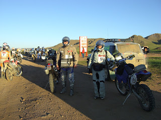 Стартовали liaison прямо с территории базы. Придурки-охранники, которым сообщили о разбитом кем-то где-то окне, перегородили дорогу железной трубой на уровне полуметра над землей. Типа самодельный шлагбаум. Сделали они это после того, как стартовали первые двое. Третьим оказался бессменный лидер монгольских ралли Гантулга. Солнце светло прямо в лицо, трубы он не заметил. Как остался жив — непонятно, учитывая грунт состоящий полностью из острого скальника. Мотик лишился крышки картера и масла. А с учетом отсутствия запчастей — сошел. Мы с Сашей проехали мимо галдящей толпы гонщиков-монголов. По башке охранникам почему-то все-таки не дали:)