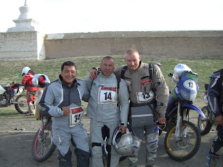 Финиш сегодняшнего этапа — в древней столице монгольских ханов, городе Хархорин. Перед стартом получилось сделать несколько фоток. Вверху (справа налево) — один из лидеров гонки Болдбатор, Раднаа, Энктур и один из механиков.